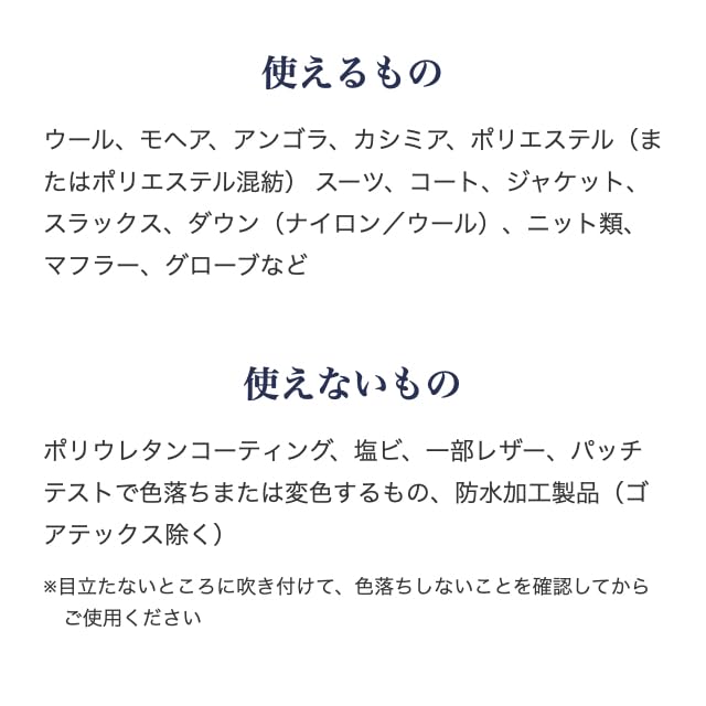 プリント生地など染色の落ちやすい製品はもちろん、ご使用前に必ず目立たないところでテストをして、問題がないことを確認してからご利用ください。