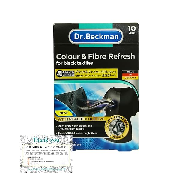 【製品】ドクターベックマン Dr.Beckmann ブラック&ファイバーリフレッシュ 黒復活シート 10枚×1箱 【生産国】ドイツ 【商品特徴】日本初の洗濯習慣、シートでブラックカラーリングと毛羽、毛玉ケア。黒い物だけ集めて、洗濯するときに1~3枚入れるだけで、黒さがよみがえるだけでなく、酵素の力で毛羽や毛玉がなくなりスムースになります。<効果がある素材>綿、綿混紡、麻、レーヨン、キュプラなど 【用途】衣類のカラーリングとダメージケア 【使用方法】1. 黒い衣類を集めて洗濯機へ入れ、洗剤を入れる。1回の洗濯の目安は3kg。2. 洗濯機にシートを1~3枚入れる。枚数が多いほど、色が濃くなり、毛羽立ちがスムースになります。黒色を長持ちさせるために、定期的に1枚入れて洗濯してください。3. 洗濯が終わったら、シートを取り除き、ゴミ箱へ捨ててください。 海外製品のため予告なくパッケージが変更される場合がございます。