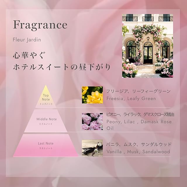 光溢れるガーデンでローズやピオニーの華やか香りに包まれる、フルールジャルダンの香り。