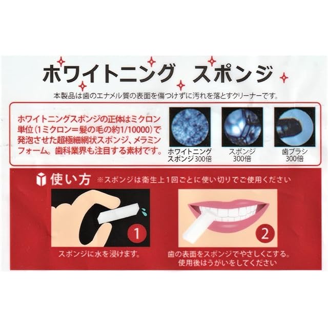 **ホワイトニングスポンジの効果と使い方** ホワイトニングスポンジは、歯の表面についた着色汚れを少しずつ薄くしてくれる効果があります。特殊加工のメラミンスポンジを歯ブラシのように、歯に押し当てるように使います。 以下はホワイトニングスポンジに関する詳細です。 1. **効果**: - 歯の表面のエナメル質を傷つけずに着色汚れのみを落として白くしてくれます。 - 歯の内部に染み込んだ着色は落とせないため、すべての歯の黄ばみを改善できるわけではありません。 2. **正しい使い方**: - ホワイトニングスポンジを水で濡らし、歯の着色汚れを優しく擦ります。 - スポンジが歯茎に当たると出血や炎症などのトラブルを引き起こす場合があるので、歯茎には当たらないように擦りましょう。