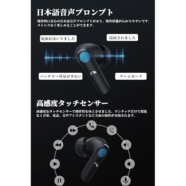 Bluetooth5.3・日本語音声プロンプト:Bluetooth5.3採用したブルートゥースイヤホンは安定した接続を提供します。音声とビデオの同期が向上し、ゲームプレイや通話の品質が向上します。さらにこのワイヤレスイヤホンは日本語音声プロンプトも搭載し、操作簡単です。高感度なタッチを押すだけで、音楽の再生・一時停止・音量調整・曲送り・曲戻し、着信の応答・拒否・終話などの操作が実現します。イヤホンの使い方に不安を感じることが軽減します。