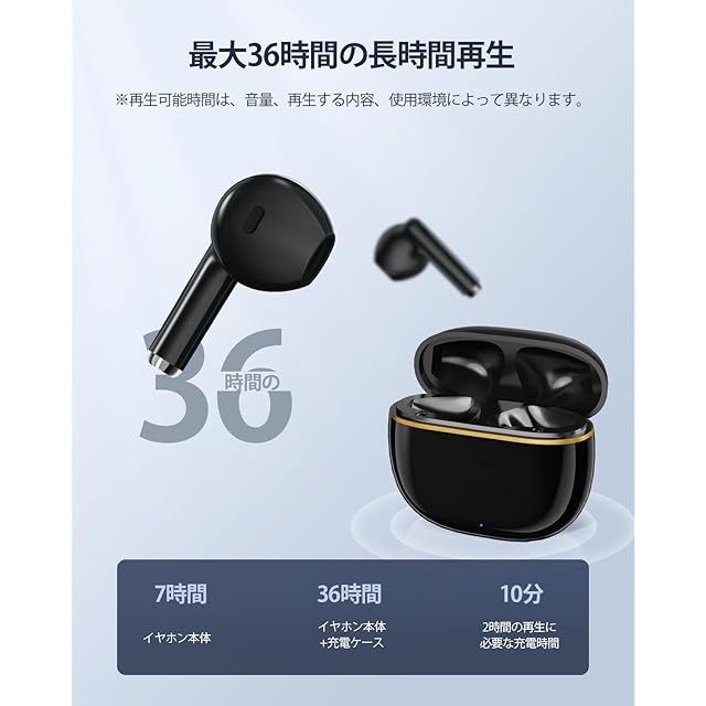 Type-C急速充電&36時間再生: 超軽量で大容量の3200mAhリチウム電池を搭載したポータブル充電ケースは、1回の充電で5~6時間以上途切れることなく音楽や通話を楽しむことができます。充電ケースとの合計で最大36時間使用できるので、使用時にバッテリー切れの心配がありません。急速充電対応のType-Cポートを搭載しているので、充電もさらにスピーディーに行えます。万が一、イヤホンの電池が切れても、10分間充電して60分間再生することが可能です。
