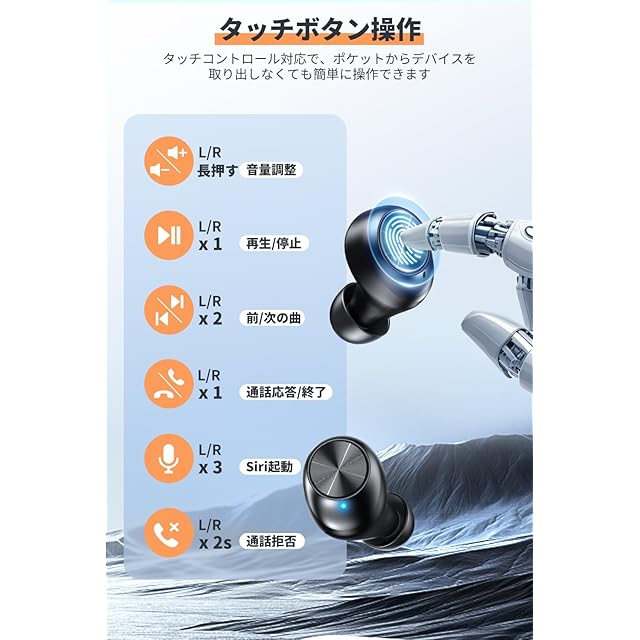 【タッチボタン】本bluetoothイヤホンはタッチコントロール対応で、ポケットからデバイスを取り出しなくても音量調整/音楽再生/一時停止、通話/終了/拒否/次の曲/前の曲/Siri起動などの簡単な操作ができます。【IPX7防水】IPX7防水性能により、どちらの方向からの水の飛沫も入られません。汗や塵を防ぎ、ランニング、フィットネス、アウトドアスポーツなど運動中に汗をかいても大丈夫です。※ご注意:充電ケースは防水仕様ではありません。【パッケージ内容】パッケージ内容:充電式収納ケース、Bluetoothイヤホン*2、Type-C充電ケーブル、イヤーピース×3ペア(Mが初期装着)、日本語取扱説明書。