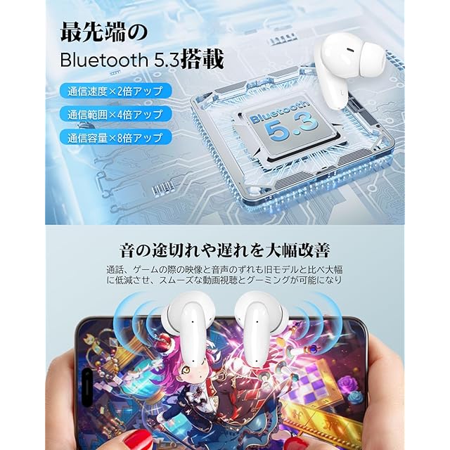 最新のBluetooth 5.3と高忠実な音質:技適マーク認証済み商品(周波数帯:2.40〜2.48GHz)。当社のワイヤレスイヤホンは先進的なBluetooth 5.3技術とアンテナ技術を採用し、15mのBluetooth範囲で高速かつ安定した伝送を提供します。内蔵の高音質オーディオチップが音楽の細部まで捉え、鮮明な高音と適度な低音のある豊かなサウンドを実現します。ENC通話ノイズキャンセリング技術により、周囲の騒音やエコーを低減し、クリアなBluetoothイヤホンHi-Fiサウンドを実現します。普段使いはもちろん、リモートワーク利用時のテレビ会議、通話での利用など特に音質にこだわりを持った方におすすめです。