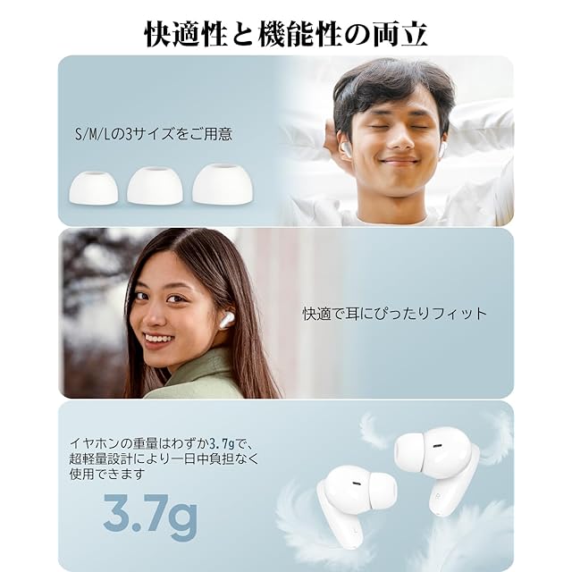 小さくて絶妙・携常便利: 新型のワイヤレスイヤホンは、小型で繊細、非常にコンパクトで持ち運びに便利です。本体重量はわずか40グラムで、手のひらやポケットに収まるサイズです。外出時には軽々とバッグに収納でき、全く邪魔になりません。人間工学に基づいたデザインのイヤホンは、非常にコンパクトで軽量(約4グラム)です。耳にしっかりフィットし、耳に不快感や圧力を与えることはありません。長時間の使用でも簡単に外れることはなく、耳の疲労も軽減されます。