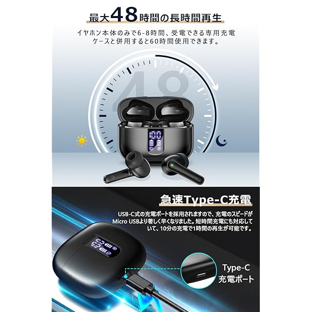 ワイヤレスイヤホン イヤホン bluetooth マイク付き ブルートゥース イヤホン ENCノイズキャンセリング LEDディスプレイ表示 Hi-Fi音質 自動ペアリング 瞬間接続 ハンズフリー通話 コードレスType‐C急速充電 超軽量設計 小型 片耳/両耳 会議/テレワーク/通学/通勤/音楽/ゲーム用