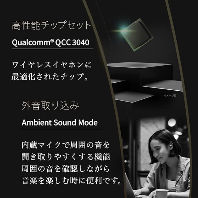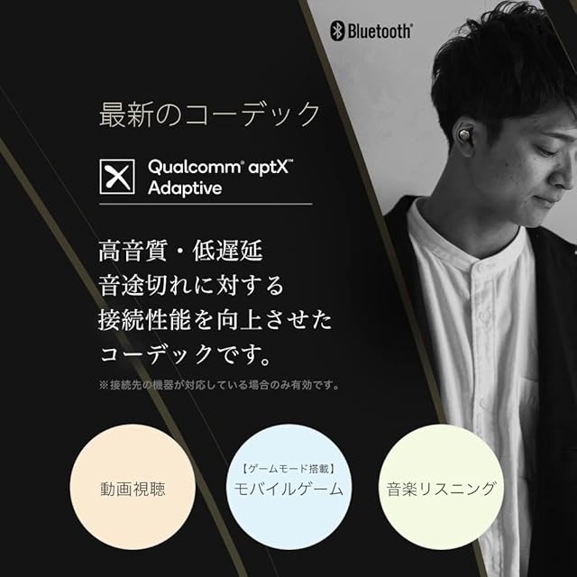 aptX Adaptiveコーデック対応で高音質・低遅延:デバイス接続時のデータ転送のビットレートを可変させることで通信状況に合わせて自動的にデータ量を調整し、最適なバランスで高音質と低遅延の両立を実現しています。左右同時伝送による安定した接続性:Qualcomm QCC3040チップセットを採用することで、左右独立受信方式であるQualcomm TrueWireless Mirroringが搭載されています。これにより、左右同時伝送で安定した接続性を実現しました。一方の電源をオフにするか、クレードルに収めることで、片耳での使用も可能です。