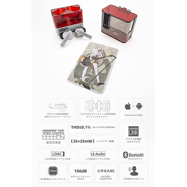 水月雨 MoonDrop 超音波 - Ultrasonic ワイヤレス イヤホン 最大24時間音楽再生 インナーイヤー型 Bluetooth 5.3 【 新型Al-Mg合金振動板を搭載した / LDAC対応 / 超低延迟55ms / 高性能ANC / 超広帯域で高解像度の音質 / 五檔低音調節切換】