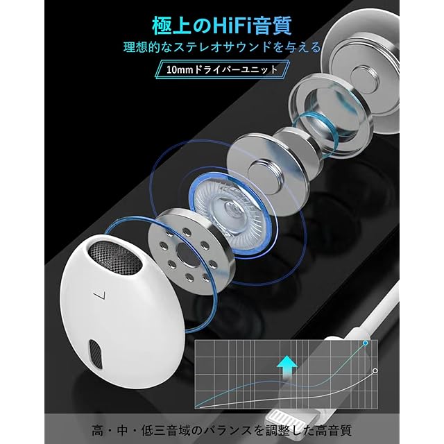 【Apple MFi正規認証品・使用簡単】この有線イヤホンは正規MFi認証が取得済みです。認証されたICチップと純正素材を採用するため、安定して雑音なしのHiFi高音質を提供できます。何の設定も要らなく、差込だけで高音質音楽を楽しむことができます。Lightning イヤホンならやはりMFi認証済みの方は安心!