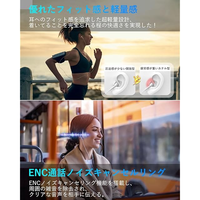 【超軽量・優れた装着感】このマイク付きイヤホンは人間工学に基づき、曲線美を活かしたインナーイヤー型イヤホンで、耳にやさしく完璧にフィットし、外れにくく、圧迫感もなく、つけたときの窮屈さが少なく、長時間装着しても快適につけられるのが魅力です。通勤、通学、ランニングなどの時は快適に装着できます。イヤホン本体は超軽量で、耳に負担をかけなく、着け心地が抜群です。