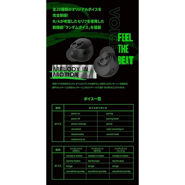 前モデルの10種類のボイスから大幅に増加し20種類のボイスを完全新録。 コラボモデル第一弾同様、電源のON/OFFや端末との接続状況をお知らせするボイスガイダンスには、二人のボイスを使用。新機能、ノイズキャンセリングのON/OFFも完全新録ボイスでアナウンスしてくれます。 さらに新たな機能として、イヤホンのボタン長押しでランダムに再生される「ランダムボイス機能」を搭載。“melody in motion“などのランダムボイスのセリフは、「みなさんにもっと音楽を楽しんでほしい」という想いのもと、二人にご提案いただきました。 また、専用アプリを使用することで、ボイスガイダンスを[錦戸さん/赤西さんMIXパターン※初期設定] [錦戸さんパターン][赤西さんパターン]、の全3パターンから選択・切り替えることができます。