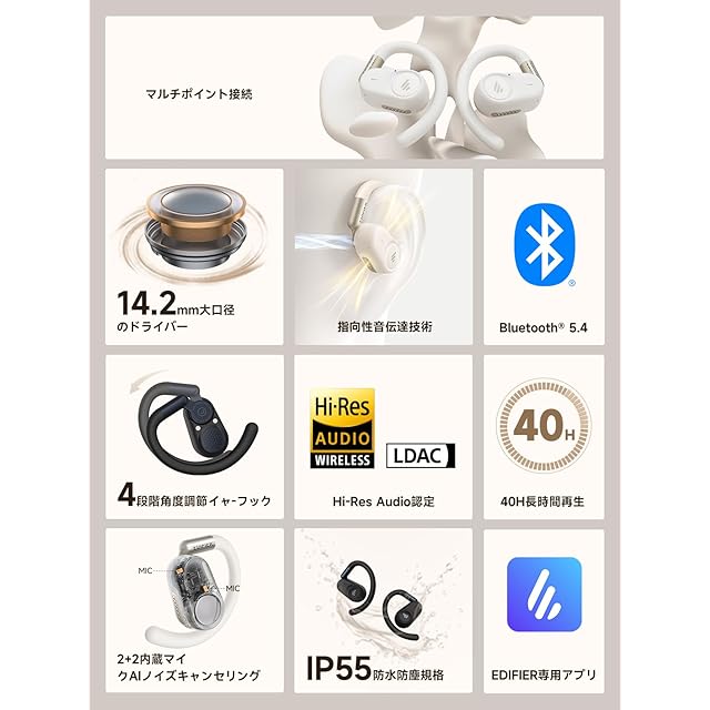 Edifier A6 オープンイヤーイヤホン 完全ワイヤレスイヤホン bluetooth 5.4 ハイレゾ対応 耳を塞がない ENC通話ノイズキャンセル マイク付き IP55防塵防水/最大40時間再生/急速充電/AAC/SBC/LDAC完全対応/マルチポイント接続/音漏れ防止 8.8g軽量 スポーツイヤホン 2025年新登場