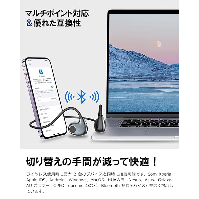 【耳をふさがない空気伝導・簡単な操作】オープンイヤー型イヤホンは普通Bluetooth イヤホンのような閉塞感がないです。耳を塞がないで耳穴が開放されているから、耳に負担がかかりにくく快適にに使えます。骨伝導イヤホンのむず振動感や圧迫感がなく、振動や圧迫から解放できます。こつでんどう イヤホンのただ7時間ぐらいの連続再生と比べて、最大15時間連続再生可能!