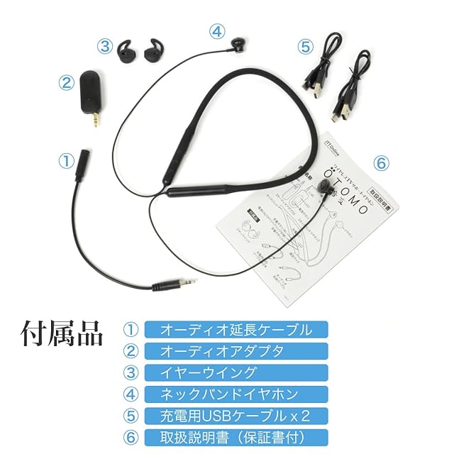 商品名:ワイヤレスTVサポートイヤホン OTOMO 音友<br> 型 番:WTSEOB<br> 保 証:商品到着より6ヶ月<br> サイズ:ネックバンド:約 奥行165mm × 幅130mm × 高さ15mm ・イヤホンケーブル長:約255mm(ケーブル端子含まず) ・ オーディオアダプタ:約 奥行46mm × 幅21mm × 高さ13mm<br> 重 量:ネックバンド:約 29g ・オーディオアダプタ:約 12g<br> 素 材:ABS樹脂、シリコン<br> 充電方式:USB AC電源アダプタ(別売)又はTV、パソコン等のUSB端子から充電<br> 電 源:内蔵リチウムポリマー(Li-polymer)バッテリー<br> 接続方式:アナログ2.4GHz、Bluetooth 5.0 <br> 接続距離 :2.4GHz接続距離 約10m<br> 動作時間:約 10時間(使用環境により変動)<br> 充電時間:約 2時間 <br> 付属品:ネックバンドイヤホン、オーディオアダプタ、充電用USBケーブルx2、オーディオ延長ケーブル、イヤーウイング、取扱説明書(保証書付)<br> <br> ※使用者の聞こえの度合いによって効果が表れにくい場合もございます。あらかじめご了承ください。<br> ※必要以上の過大音による聴取はさけて下さい。過大音の長時間聴取は聴力低下を招く場合があります。<br> ※万が一製品に異常を感じた場合は、ただちに使用を中止して下さい。<br> ※本製品を使用時に生じた、いかなる損害についても弊社は一切の責任を負いません。必ずお客様の責任においてご使用いただけますようお願い致します。