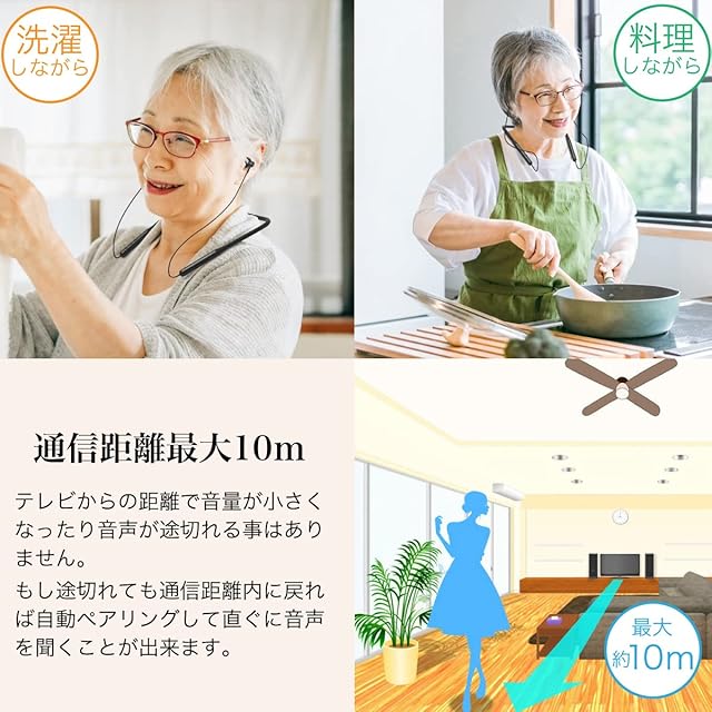 【通信距離最大10m!動きながらでも音声が途切れず遅延も無し】ワイヤレスなのでテレビの間にケーブルの取り回しがありません。キッチンで料理をしたり隣の部屋に移動するなど、壁やドアなどの障害物があっても音が途切れにくく離れた場所でもテレビの音を聞くことができます。2.4GHzワイヤレス通信なのでテレビの映像と音声にズレがありません。