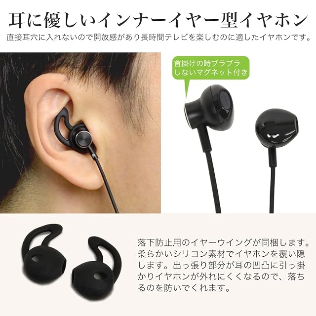 【長時間使用しても疲れにくい】耳にひっかけて装着するインナーイヤー型タイプのイヤホンです。重さがわずか約29gと超軽量なので長時間の使用でも快適にテレビを視聴できます。ネックバンド部分には曲げても壊れなく首に心地よくフィットするシリコン素材を採用しました。