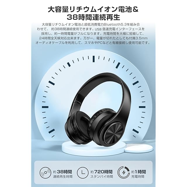 【38時間連続再生/急速充電】ワイヤレスヘッドホンは大容量バッテリと超低消費電Bluetooth5.3を組み合わせて、 本製品は約38時間を連続使用できます。約1時間充電が電力フルです。充電時間を大幅に短縮して、一日の使用に完全に満足して、いつでもどこでも音楽を楽しむことができます。全てのデバイス(iphone/ipad/Android)に接続されている場合、ヘッドセットの電量が表示できます。