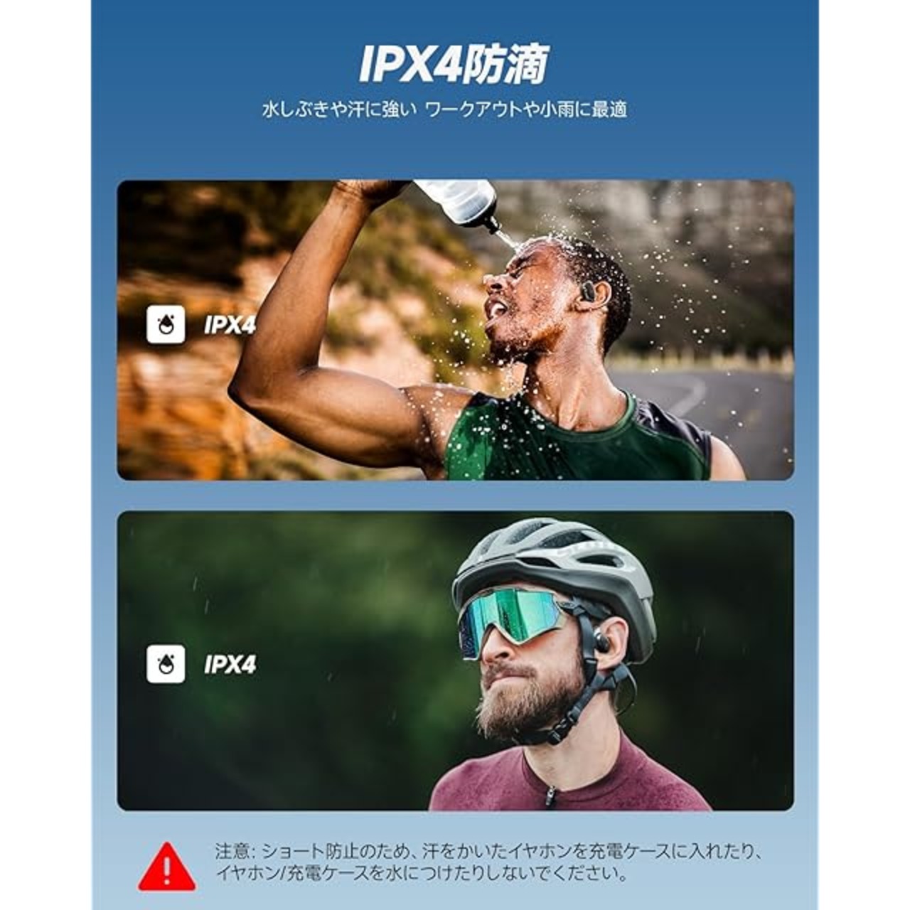 【人間工学に基づいたデザイン、IPX4防滴】Dobuds OPENは人間工学に基づいたイヤーフックを採用し、どんなワークアウトでもしっかりフィットします。快適でIPX4防水設計により、霧雨、雨、汗の心配がありません。(注意:ショートを避けるため、汗をかいたイヤホンを充電ケースに入れたり、イヤホン/充電ケースを水に浸けたりしないでください)
