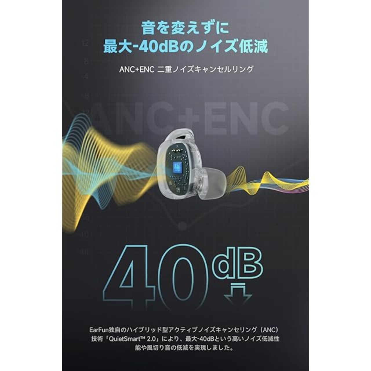 [ANCパフォーマンス]EarFun独自のANC技術QuietSmart 2.0を採用して、最大40dBノイズ低減できます!飛行機やバスなどの騒音環境下、また街中やカフェなどの人の声が多い環境でも、より静寂を感じられるようになりました。[6基のENCマイク]環境ノイズキャンセル(ENC)対応マイクを片側3基×2の計6基搭載、ノイズ抑制とエコーキャンセレーション、通話中の雑音や周囲のノイズを抑制し、相手の声を聞き取りやすく快適な通話を実現します。【3つのノイズコントロールモード】「アクティブノイズキャンセリング(ANC)」、「外音取り込み」、「ノーマル」。使用環境に応じて、モードを切り替えることができます。