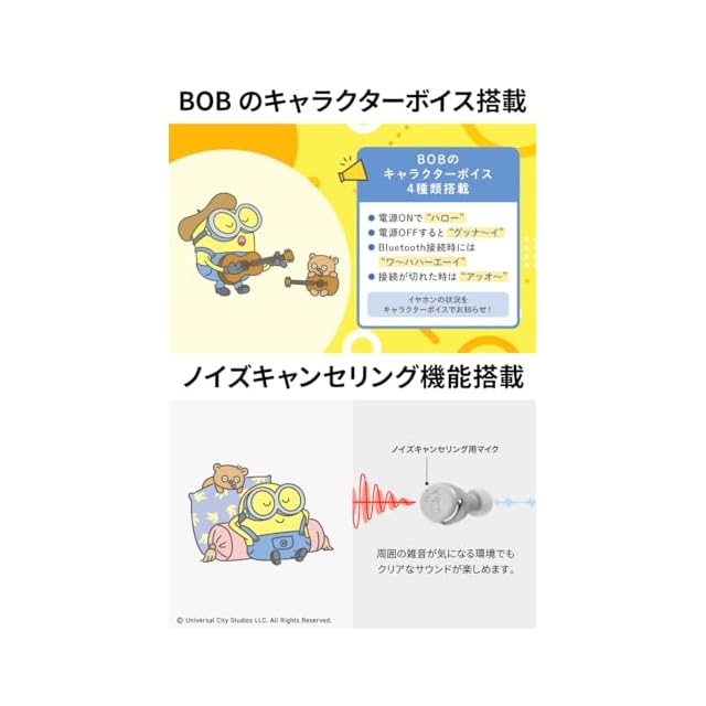 【ミニオンで、音楽を】「BOB」と「Tim」の特別描き下ろしスケッチや、「BOB」のキャラクターボイスを採用したワイヤレスイヤホン。 オーディオメーカーならではのクリアで躍動感ある心地よいサウンドで音楽を楽しめます。