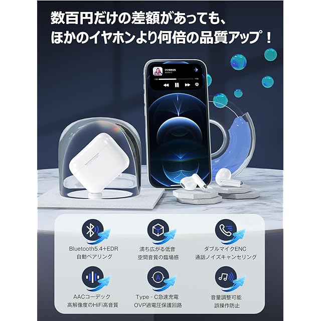 【✨究極の進化】最新のBluetooth 5.4+チップとEDR技術が搭載された、業界最高水準のワイヤレスイヤホンが登場!不安定さにさよなら、快適な音楽体験を提供します。データ転送速度と接続安定性の大幅向上で、Bluetoothの不安定さを見直します。人混みや交通機関内でも安定した通信を確保し、自動ペアリング機能で接続がスムーズです。初回接続後、蓋を開けたら自動ペアリングできます。音飛びや音途切れが少なくなり、音楽と通話の質が向上します。 ENC機能とcVc 8.0を搭載し、使用者周囲の騒音を排除、通話相手にクリアに提供します。ビジネス通話やWEB会議、テレワークに最適なクリアな通話体験を提供。プレゼントとして贈るにも理想的な選択です。