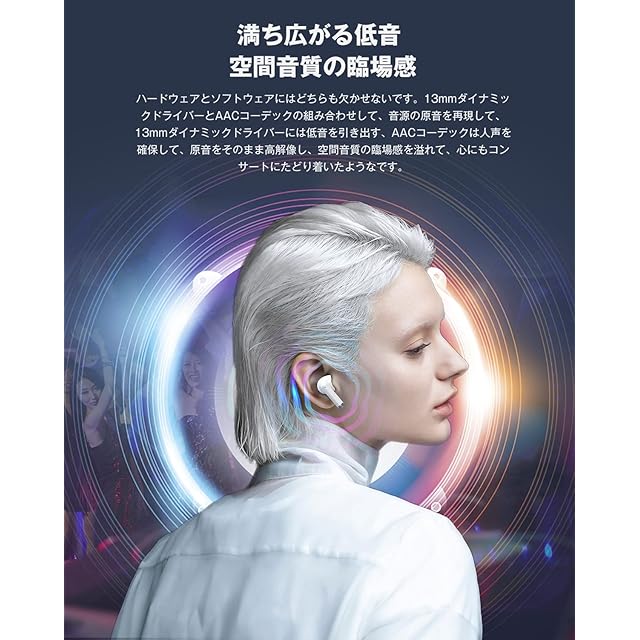 【音楽の深みを探索】13mm径のダイナミックドライバーでワイヤレスイヤフォン、空間オーディオ音質を実現、音楽の深みと広がりを体験。 AACコーデックとSBCコーデックに対応し、スマホと最適な組み合わせで高解像度音源を完全再生でき、HI-FI音質に相応しいです!んなタイプの音楽にも合わせ、その音楽の特性を引き出し、音楽の魅力を最大限に引き出します。音楽の魅力を引き出す!