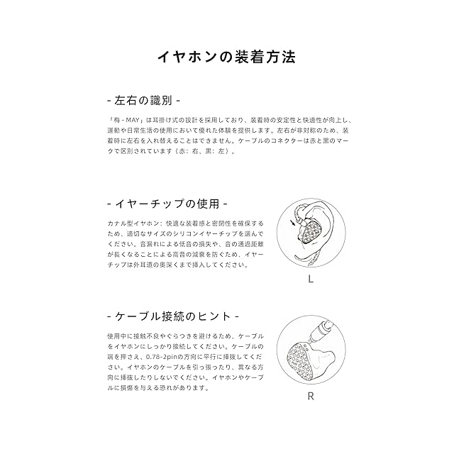 【左右の識別】「梅 - MAY」は耳掛け式の設計を採用しており、装着時の安定性と快適性が向上し、運動や日常生活の使用において優れた体験を提供します。左右が非対称のため、装着時に左右を入れ替えることはできません。ケーブルのコネクターは赤と黒のマークで区別されています(赤:右、黒:左)。
