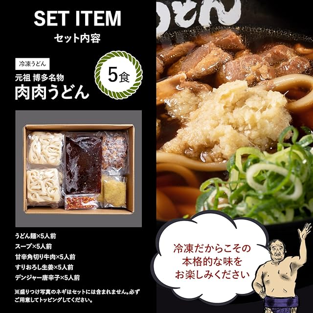 福岡博多で行列になる「博多名物元祖肉肉うどん」 お店で使用している食材をそのまま冷凍する事で、お店の味をそのままお家で楽しめる商品です。 生姜、デンジャー唐辛子もセットにしており、ネギだけを準備頂ければ肉肉うどんが完成します。 【配送不可地域】 離島 【製造】 スープ、生姜、唐辛子:福岡市博多区堅粕3丁目17番5号 麺:一品香食品株式会社 牛肉:株式会社小林食品 市内工程:麺の仕入れ、スープの製造、麺以外の原材料の調達、品質保持、梱包 市外工程:麺の製造 事業者 :株式会社NKworks 連絡先 :092-402-1777<BR><BR>【内容量・サイズ等】<BR>肉肉うどんスープ 5袋 味付け牛肉 5袋 うどん麺 5人前 擦りおろし生姜 5袋 デンジャー唐辛子 5袋 <原材料名> 味付け牛肉:牛肉(カナダ産)、糖類(砂糖、黒蜜)、たん白加水分解物、醗酵調味料、醤油、糖加工品、食塩/カラメル色素、調味料(アミノ酸等)、ビタミンB1、(一部に牛肉・大豆・小麦・豚肉を含む) うどん麺:めん【小麦粉(国内製造)、食塩/加工でんぷん】 スープ:水、たん白加水分解物、醤油、砂糖、醗酵調味料、動物油脂、糖加工品、香味油、畜肉エキス、リンゴ果汁、昆布エキス、魚介エキス、にぼし粉末、しいたけエキス/調味料(アミノ酸等)、カラメル色素、増粘剤(キサンタンガム)、甘味料(スクラロース、ステビア、甘草)、(一部に小麦を含む) 擦りおろし生姜(国産) 唐辛子(中国産) 【アレルギー情報】 小麦、大豆、牛肉、豚肉、りんご
