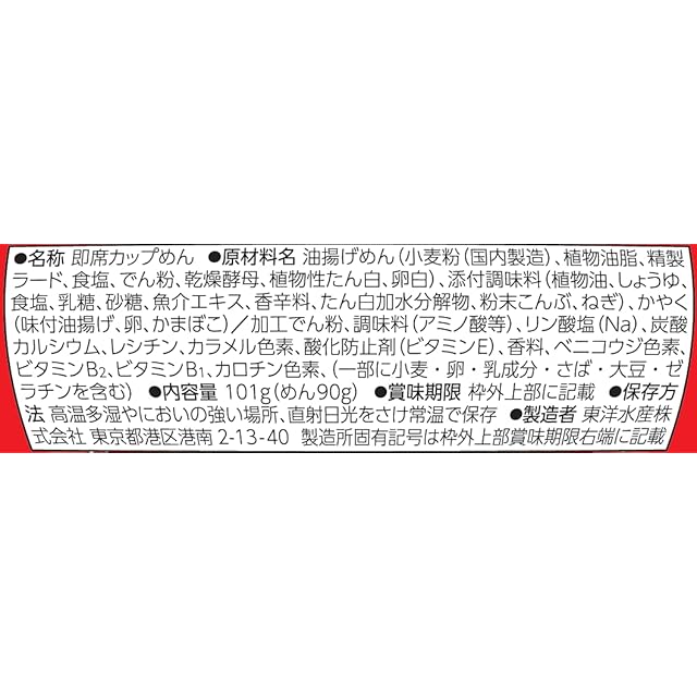 原材料:油揚げめん(小麦粉(国内製造)、植物油脂、精製ラード、食塩、でん粉、乾燥酵母、植物性たん白、卵白)、添付調味料(植物油、しょうゆ、食塩、乳糖、砂糖、魚介エキス、香辛料、たん白加水分解物、粉末こんぶ、ねぎ)、かやく(味付油揚げ、卵、かまぼこ)/加工でん粉、調味料(アミノ酸等)、リン酸塩(Na)、炭酸カルシウム、レシチン、カラメル色素、酸化防止剤(ビタミンE)、香料、ベニコウジ色素、ビタミンB2、ビタミンB1、カロチン色素、(一部に小麦・卵・乳成分・さば・大豆・ゼラチンを含む)