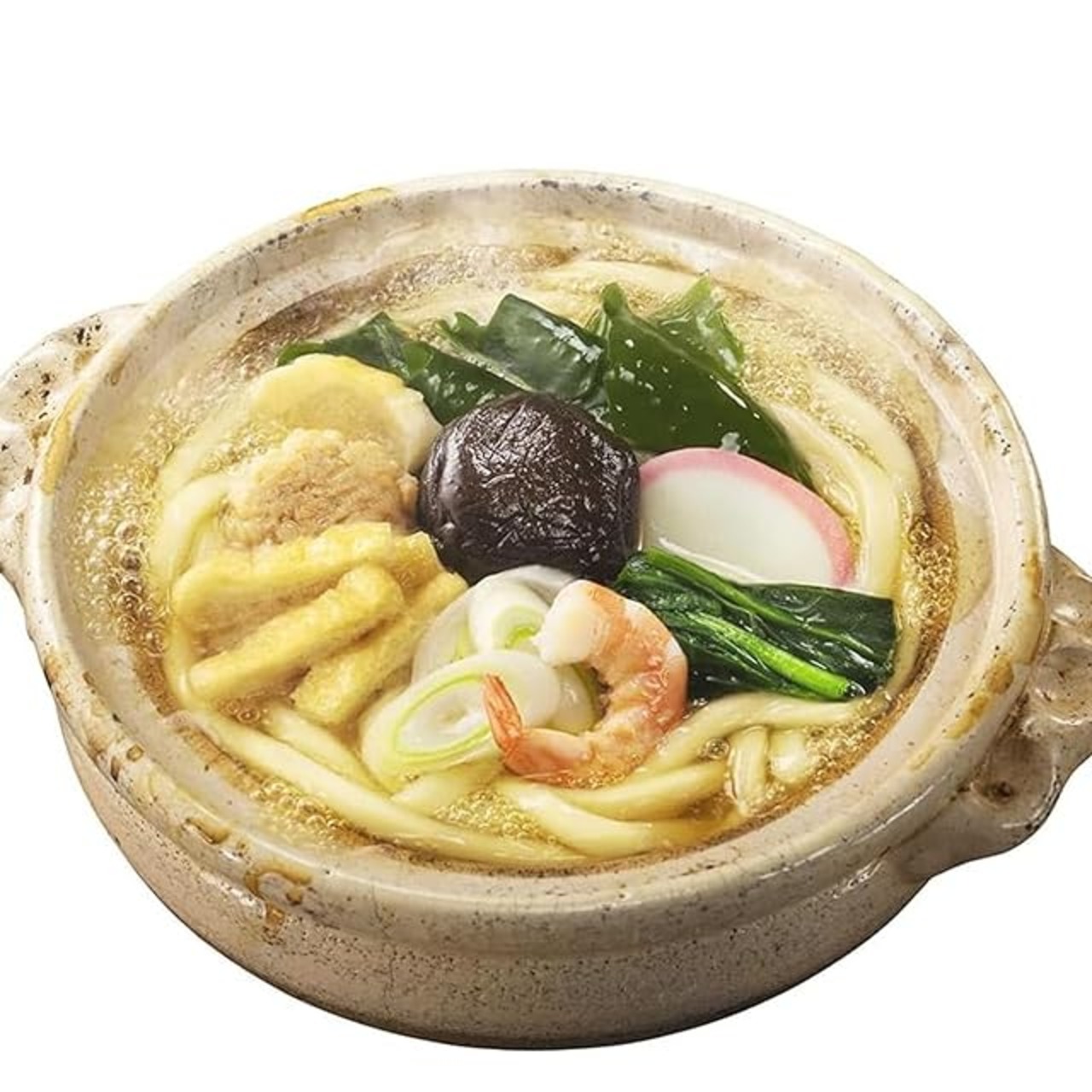 原材料: つゆ〔しょうゆ、みりん、いわし削りぶし、さば削りぶし、鶏肉、砂糖、酒、ゼラチン、食塩、かつお削りぶし、そうだかつお削りぶし、昆布、椎茸粉末 / 調味料(アミノ酸等)〕、めん〔小麦粉(国内製造)、食塩 / 加工でん粉〕、具〔味付け椎茸、ねぎ、鶏つくね、味付けほうれん草、ボイルえび、かまぼこ、きざみ揚げ、わかめ、麩 /加工でん粉、豆腐用凝固剤、酸化防止剤(V.E)、着色料(トマト色素)〕、(一部に小麦・卵・えび・大豆・鶏肉・豚肉・さば・ゼラチンを含む)