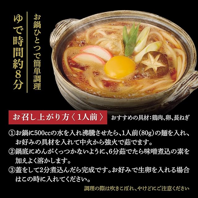 麺は下茹でなしでも調理できるよう塩分を減らした細麺タイプの乾麺です。 細麺でも乾麺を使用することでしっかりとした食感を味わえます。 名古屋の味噌煮込みうどんはかたい麺が特徴的ですが、かたい麺が苦手な人にもおいしくお召し上がりいただけます。