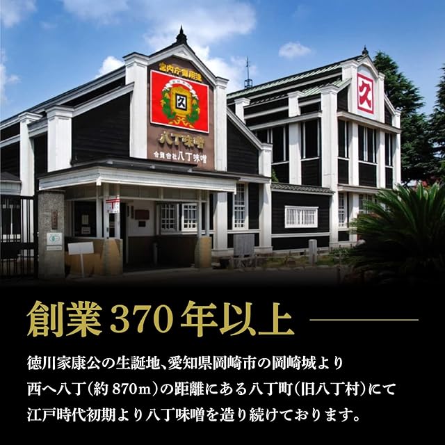 創業1645年(正保2年)より今日まで変わらぬ製法で八丁味噌を仕込んでおります。 八丁味噌は、大豆と塩のみを原料に大きな木桶に仕込み、天然の川石を職人の手で山のように積み上げて重石とし、 八丁町(旧・八丁村)の気候風土のなかで二夏二冬(2年以上)天然醸造で熟成させて出来上がります。 味は大豆のうま味を凝縮した濃厚なコクと少々の酸味、渋味のある独特な風味が特徴です。
