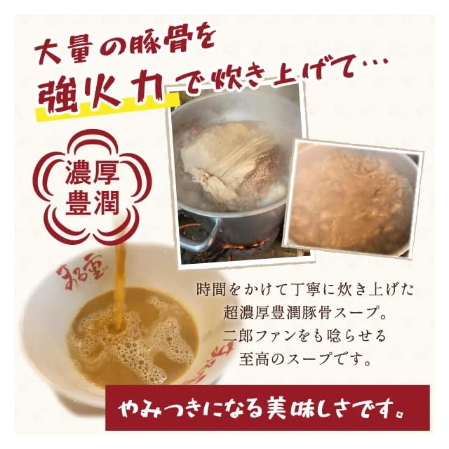 本当に美味しい二郎系食べた事ありますか? 店舗で冷凍なので味はそのまま、 これが濃厚豊潤とんこつラーメンです! 大量の豚骨を強火力で炊き上げた 濃厚豊潤とんこつスープ。 分厚くぷるっぷる、箸で切れるほど 柔らかい熱々の豚。 オーション粉100%のもっちり平打ち麺は スープに絡みます。 最高の一杯が完成しました。 冷凍にすることで、 店内でのお食事と遜色ない仕上がりになります。 モヤシとキャベツは冷凍する事ができませんので、 付けておりません。 お野菜をフライパンで炒めて盛り付けると より一層美味しくなります。 ●内容量 ■オーション粉100%平打ち麺(220g) ■濃厚豊潤豚骨スープ(330cc) 極厚豚バラチャーシュー1枚 入り 賞味期限 30日 保存方法 冷凍-15℃以下 解凍した場合は 冷蔵5度以下で賞味期限2日です。 お早目にお召し上がりください。 お届けはクール宅急便で。