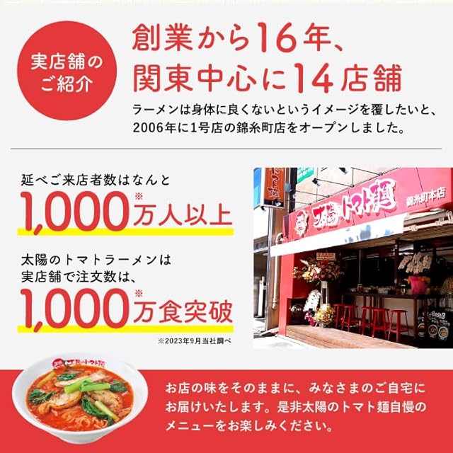 罪悪感なしで食べられる噂の\ギルトフリー/なトマトラーメン。ラーメンは身体に良くないというイメージを覆したいと、2006年に1号店の錦糸町店をオープン。創業から16年、関東中心に14店舗を構えるトマトラーメン専門店です。延べご来店者数は1,000万人以上。実店舗注文数はおかげ様で\1,000万食突破/愛され続けるお店の味をそのままお届けいたします