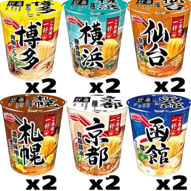 新ブランド「ご当地の一杯」誕生!<br> 豊富なバリエーションで全国各地のご当地ラーメンの味わいを手軽に楽しめる!<br> 6種各2個、計12個のセットです <br><br> 【セット内容】<br><br> ●函館 塩ラーメン 2個<br> チキンをベースにホタテやカツオ等の魚介の旨みを利かせた塩スープです。後入れの液体スープを加えることで、鶏油を利かせた旨みのある一杯に仕上げました。 <br><br> ●京都 背脂醤油ラーメン 2個<br> ポークをベースに醤油、香辛料を加えた醤油スープです。後入れ背脂パックでコクを与え、深みのある一杯に仕上げました。 <br><br> ●札幌 濃厚味噌ラーメン 2個<br> チキンとポークをベースに生姜を利かせた濃厚味噌スープです。後入れ液体スープで肉や野菜を炒めたような風味や味噌のコクを加え、濃厚感のある一杯に仕上げました。 <br><br> ●横浜 豚骨醤油ラーメン 2個<br> 豚骨のコクとガーリックの風味を利かせた豚骨醤油スープです。後入れ液体スープで醤油のキレと鶏油が利いた深い旨みのある一杯に仕上げました。 <br><br> ●仙台 辛味噌ラーメン 2個<br> ポークの旨みに唐辛子の辛味が利いた味噌スープです。仙台味噌入りの後入れ液体スープを入れることで、深い旨みのある一杯に仕上げました。 <br><br> ●博多 背脂とんこつラーメン2個<br> 複数種のポークエキスをベースとした豚骨スープです。後入れ背脂パックを加えることで、お店で味わえるような臨場感ある香りとコクのある一杯に仕上げました。