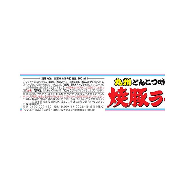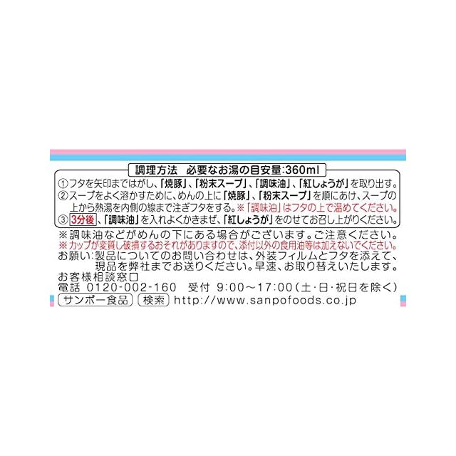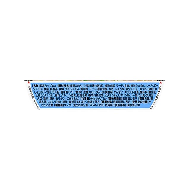 原材料:油揚げめん(小麦粉、植物油脂、ラード、食塩、植物たん白)、スープ(ポークエキス、豚脂、乳製品、食塩、チキンエキス、香辛料、植物油脂、醤油、魚介エキス)、 かやく(焼豚、紅しょうが、コーン、ねぎ)、加工でん粉、調味料(アミノ酸等)、炭酸カルシウム、かんすい、カラメル色素、紅麹色素、酸化防止剤(ビタミンE)、クチナ シ色素、香料、香辛料抽出物、酸味料、ビタミンB2、ビタミンB1、(原材料の一部にゼラチン、ごまを含む)