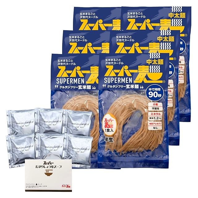 【待望のスープ付きスーパー麺】<br> グルテンフリー玄米麺に、待望のスープ付きが誕生!<br> 麺だけでなく、スープにも小麦不使用、ヘルシーでおいしいラーメンを90秒でお楽しみいただけます。<br><br> 【スーパー麺】<br> 国産玄米と北海道産ばれいしょでん粉のみを使ったグルテンフリー麺。<br> 食べるほどに強くなる玄米由来の豊富なミネラルと、独自製法で生パスタのような「つるモチ」食感を実現しました。<br>アミノ酸などの化学調味料・保存料・着色料は使っていません。<br><br> 【スーパーたまりしょうゆスープ】<br> 原料の大豆を蒸して麹を加え、できた味噌玉を1年間以上発酵させて作られる醤油のこと。<br> 伝統的製法のたまり醤油を贅沢に使ったラーメンスープ<br> <br> 【鍋ひとつで簡単調理】<br> お湯を沸かして90秒ゆでて完成。<br> エネルギーと時間を節約をしつつ、グルテンフリーのたまり醤油ラーメンスープと一緒にお楽しみください。<br> 6食入り。<br><br> 【賞味期限】<br> 常温保存で製造から1年<br> 【栄養成分表示】<br> 製品1食当たり(めん100g、スープ39g) <br> エネルギー 292kcal たんぱく質 6.7g 脂質 3.0g 炭水化物 58.6g-糖質 57.3g-食物繊維 1.3g 食塩相当量 4.9g 亜鉛 1.2mg カリウム 190.0mg 鉄 1.3mg マグネシウム 23.9mg <br> 【原材料名】<br> 【玄米麺】玄米(国産)、馬鈴薯でん粉(馬鈴薯(北海道産))<br> 【スープ】清酒(国内製造)、食塩、たまりしょうゆ、ポークエキス、ごま油、チキンエキス、酵母エキス、てんさい糖、香辛料、米黒酢、(一部に大豆、豚肉、鶏肉、ごまを含む) <br> 【アレルギー情報】大豆・鶏肉・豚肉・ごま。スープ製造工場では、小麦、えび、かに、乳製品を含む製品を製造しています。<br>