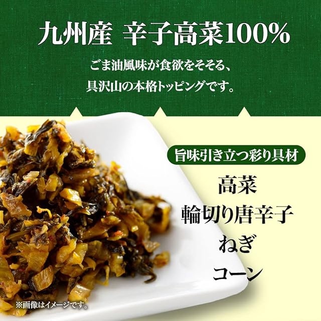 ゴマ増量でさらに風味と旨みがアップ!福岡・博多で豚骨ラーメンのトッピングとしておなじみの辛子高菜をあわせました。九州産辛子高菜を100%使用した「生の辛子高菜」はごま油で風味よく仕上げ、ラーメンとの相性は抜群です。博多らしい細麺を使用しており、輪切り唐辛子やコーン、ねぎも入り彩りも鮮やかです。