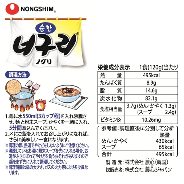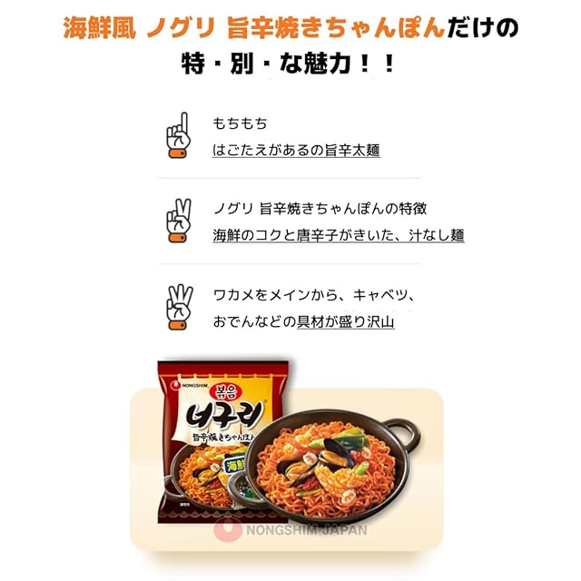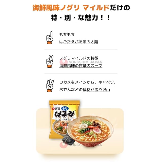 ノグリラーメン 袋麺 : 麺はコシのある太い麺、もちもちとした食感とうどんのような食べ応え。 スープは唐辛子と貝、いか、えび、かつおなどさまざまな海鮮でだしをとった海鮮スープで、辛いながらもさっぱりした味が特徴です。具材は大きい昆布とわかめ、いか、にんじんを入れ、海鮮の旨味をアップしています。ブランドネームの「ノグリ」は麺が丸くてぽっちゃりした感じが狸(韓国語ではノグリ)をイメージするということでネーミングされたものです。