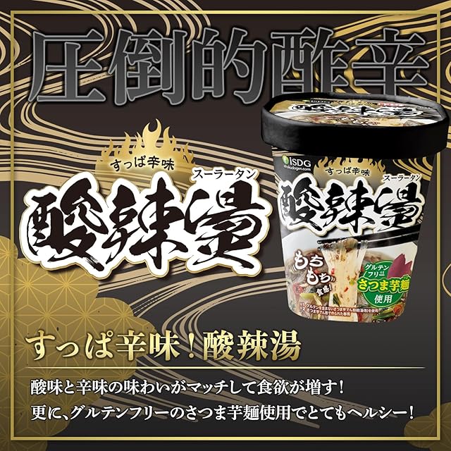 すっぱ辛味!酸辣湯 ・グルテンフリー※1 ・もちもち食感のさつまいも麺※2仕様 ※1 グルテンを含まないさつまいも芋でん粉麺(春雨)を使用 ※2 さつま芋でん粉で作られた春雨 ================= さつま芋粉で作られた春雨は、健康的なだけではなく、 スープをよく吸ってくれるのでしっかりした味を楽しめます。 時間が経ってもやわらかくなりすぎず、最後までもちもちの食感を楽しめます。 ================= ●酸辣湯とは? 酸味と辛味、香味のある風味豊かでパンチの効いたスープで中国で親しまれているやみつきになる一品です。