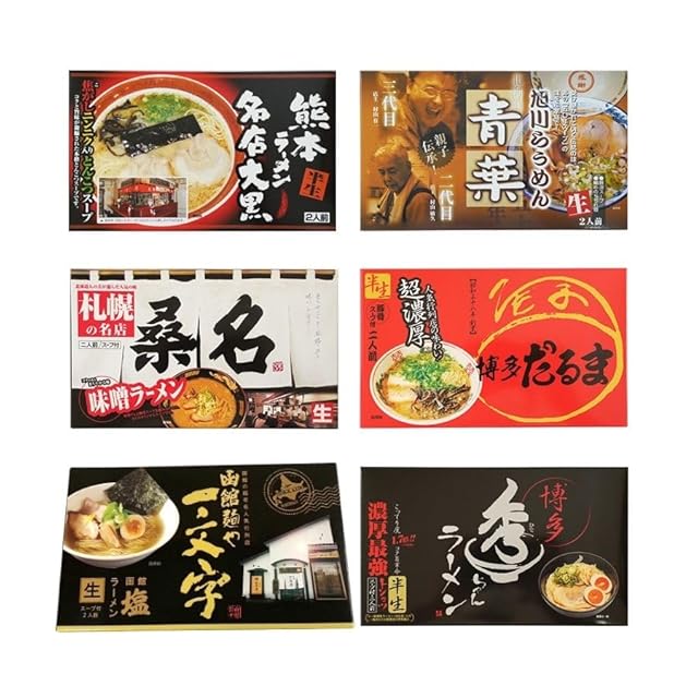 北は北海道、南は九州の有名ラーメン計6種を詰め合わせたセットです。<br> 北海道からは【旭川、札幌、函館】、九州は【熊本、博多】のラーメン激戦区に位置する超名店をかけ集めました。<br> 自宅に居ながら簡単にご当地の味を再演でき、お土産やコンペの景品などにもおすすめです。各店舗のこだわりぬかれた旨味を是非ご堪能ください。<br> <br> 【セット内容】<br> 旭川ラーメン青葉(2食)<br> ■ちぢれ細麺 ■醤油スープ<br><br> 札幌ラーメン桑名(2食)<br> ■ちぢれ中細麺 ■味噌スープ<br><br> 函館ラーメン一文字(2食)<br> ■ウェーブ細麺 ■塩スープ<br><br> 熊本ラーメン大黒(2食)<br> ■ストレート細麺 ■豚骨スープ<br><br> 博多ラーメン秀ちゃん(2食)<br> ■ストレート細麺 ■濃厚とんこつスープ<br><br> 博多ラーメンだるま(2食)<br> ■極細麺 ■背油たっぷりとんこつスープ<br>