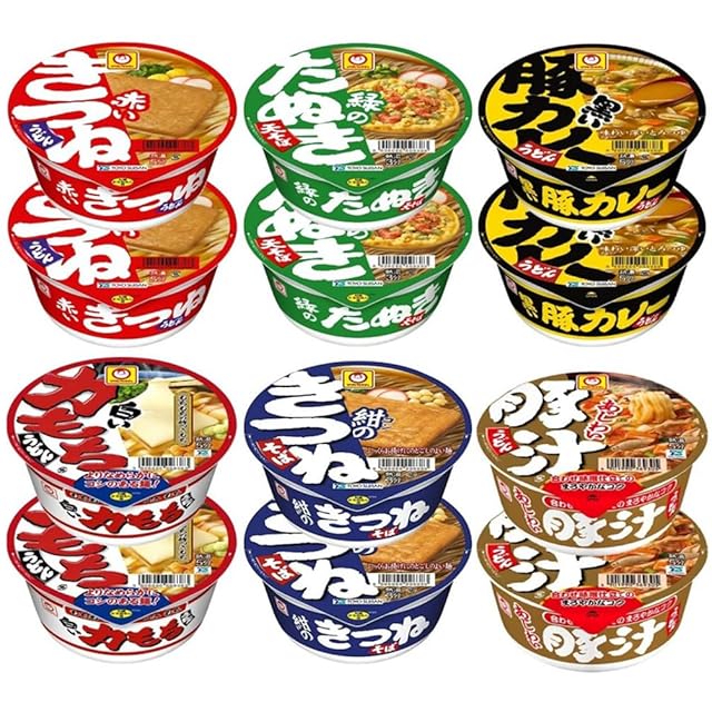 赤いきつねうどん、緑のたぬき 天そば、黒い豚カレーうどん、白い力もちうどん、紺のきつねそば、豚汁うどん 各2個計12個 詰め合わせセット。