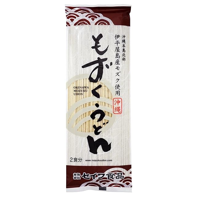 国内産小麦粉と伊平屋島産生もずくで丹念に練り上げました。 国内産小麦粉と生もずくだけでつくられております。 もずくうどんは食塩・水ほか一切のつなぎ材、及び合成添加物はまったく使用しておりません。