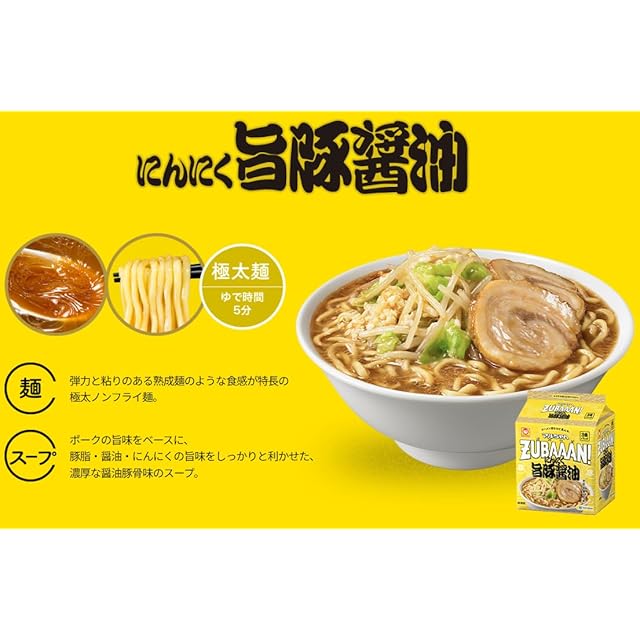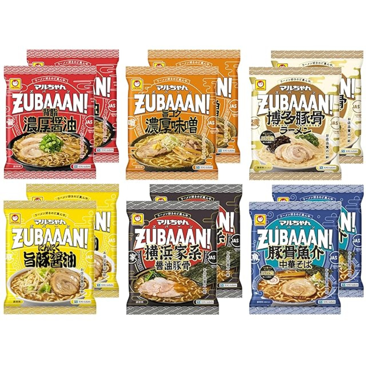 これでいいや、ではなくこれがいい!と思える、袋麺の簡便性を兼ね備えた、誰もお家にいながらにして、手軽に“お店品質のあの味”を楽しめるマルちゃんZUBAAAN!全5種類バラエティアソートセット<br> 【横浜家系醤油豚骨】熟成麺のような弾力や粘りとコシの強い麺に、鶏油の香り、コク、醤油の旨味が利いた家系醤油豚骨スープ。鶏油の香り、豚骨と鶏ガラの味わい深いコク、醤油の旨味と濃さがしっかりと利いた、家系醤油豚骨スープ。<br> 【背脂濃厚醤油】ポーク・チキンエキスをベースに、背脂を加えることで濃厚感を出し、ニンニクをアクセントに利かせた醤油味スープ。熟成麺のような弾力や粘りとなめらかさのある麺に、醤油の旨味、コク、香りと背脂を加えた濃厚醤油スープ。<br> 【旨コク濃厚味噌】ポーク・チキンエキスをベースに、ローストガーリック・ローストオニオン・山椒・生姜などで特徴を出した、濃厚な味噌味スープ。熟成麺のような弾力や粘りとコシの強いちぢれ麺に、香辛料や野菜を炒めた香ばしさのある濃厚味噌スープ。<br> 【にんにく旨豚醤油】弾力と粘りのある熟成麺のような食感で、わしわしと食べる極太なノンフライ麺。豚脂、豚の旨味、醤油感、にんにくの風味すべてをしっかりと利かせた濃厚な醤油豚骨味スープ。<br> 【豚骨魚介中華そば】熟成麺のような弾力や粘りのある太麺に、煮干や雑節を合わせた濃厚な豚骨魚介中華そばです。つけ麺でもおいしく召し上がれます。弾力と粘りのある熟成麺のような食感で、わしわしと食べる極太なノンフライ麺。ポークエキス、チキンエキスをベースに煮干しや雑節を合わせた濃厚豚骨魚介スープ。<br> 【博多豚骨ラーメン】硬さと歯切れのある豚骨ラーメンらしい食感が特長の極細ノンフライ麺。まろやかで口当たりが良く、甘旨い香りが特徴の、にんにくをアクセントに利かせた味わい深い濃厚なコクのある豚骨スープ。