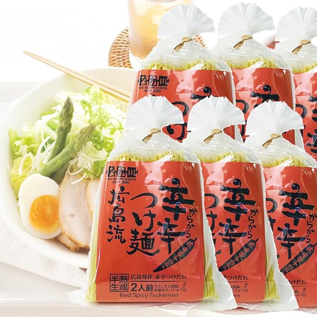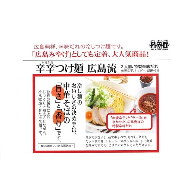【辛辛つけ麺広島流】<br> 広島発祥のつけ麺として、人気の高い商品です。<br> 広島のお土産にご家庭用にどうぞ。<br> 広島つけ麺の特徴は、ピリリと辛い赤だれにあります。<br> この辛さと旨味が調和された絶品のたれと、一昼夜じっくり熟成させて冷風乾燥させた半生中華麺お召し上がり下さい。<br> <br> 内容量:〔めん〕100g×12、〔たれ〕80g×12、〔具(赤唐辛子・胡麻)〕3g×12<br> 賞味期限:90日<br> 保存方法:直射日光、高温多湿を避け、保存してください。<br> 使用上の注意:開封後はお早めにお召し上がりください。<br>