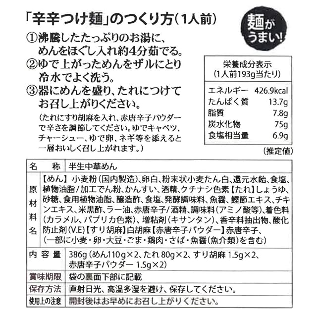 内容量:〔めん〕100g×12、〔たれ〕80g×12、〔具(赤唐辛子・胡麻)〕3g×12