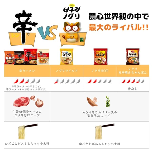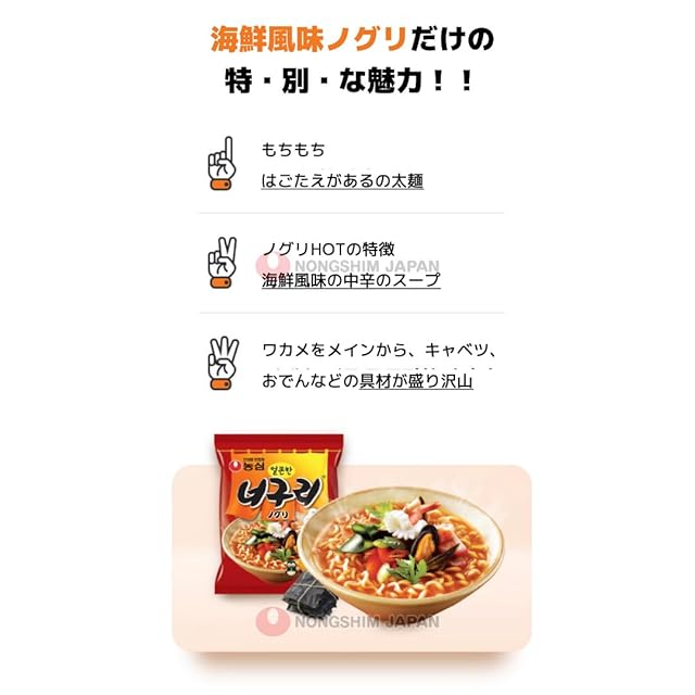 商品説明:スープは唐辛子と貝、いか、えび、かつおなどさまざまな海鮮でだしをとった海鮮スープで、辛いながらもさっぱりした味が特徴です。具材は大きい昆布とわかめ、いか、にんじんを入れ、海鮮の旨味をアップしています。ブランドネームの「ノグリ」は麺が丸くてぽっちゃりした感じが狸(韓国語ではノグリ)をイメージするということでネーミングされたものです。
