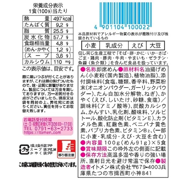 油揚げめん(小麦粉(国内製造)、植物油脂)、添付調味料(食塩、糖類、香辛料、野菜粉末(オニオンパウダー、ガーリックパウダー)、たん白加水分解物、ねぎ)、かやく(えび、しいたけ、砂糖、食塩)/調味料(アミノ酸等)、炭酸カルシウム、かんすい、乳化剤、酸味料、ソルビトール、酸化防止剤(ビタミンE)、カラメル色素、紅麹色素、ベニバナ黄色素、パプリカ色素、ビタミンB2、(一部に小麦・乳成分・えび・大豆を含む)