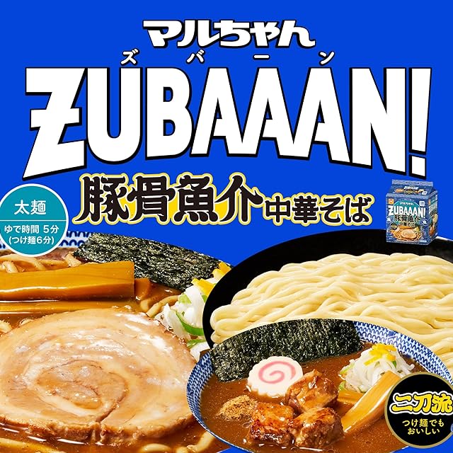 【中華そばとつけ麺の二刀流】マルちゃんZUBAAAN!シリーズ第5弾。二刀流が新登場。中華そばでもつけ麺でも食べられる袋麺。熟成麺のような弾力や粘りのある太麺に、煮干や雑節を合わせた濃厚な豚骨魚介中華そばです。つけ麺でもおいしく召し上がれます。