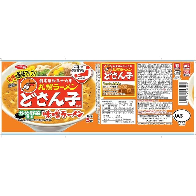 原材料名:油揚げめん(小麦粉(国内製造)、植物油脂、でん粉、食塩、粉末卵)、スープ(みそ、糖類、豚脂、食塩、植物油脂、ポーク調味料、クリーミングパウダー、香辛料、大豆加工品、香味油、野菜調味料、発酵調味料、酵母エキス)、かやく(鶏・豚味付肉そぼろ、ごま、コーン、もやし、ねぎ)/加工でん粉、調味料(アミノ酸等)、香料、炭酸カルシウム、カラメル色素、かんすい、増粘剤(キサンタン)、トレハロース、乳化剤、クチナシ色素、微粒二酸化ケイ素、酸化防止剤(ビタミンE)、酸味料、ビタミンB2、ビタミンB1、(一部に小麦・卵・乳成分・ごま・大豆・鶏肉・豚肉を含む)